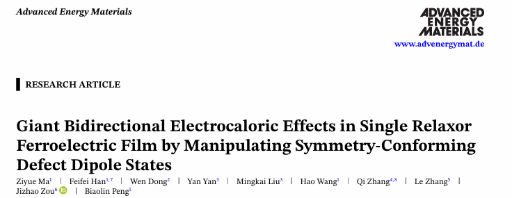 相关研究成果以“Giant Bidirectional Electrocaloric Effects in Single Relaxor Ferroelectric Film by Manipulating Symmetry-Conforming Defect Dipole States”为题,发表于材料领域顶级期刊《Advanced Energy Materials》 (2025年影响因子26.8)。免费av