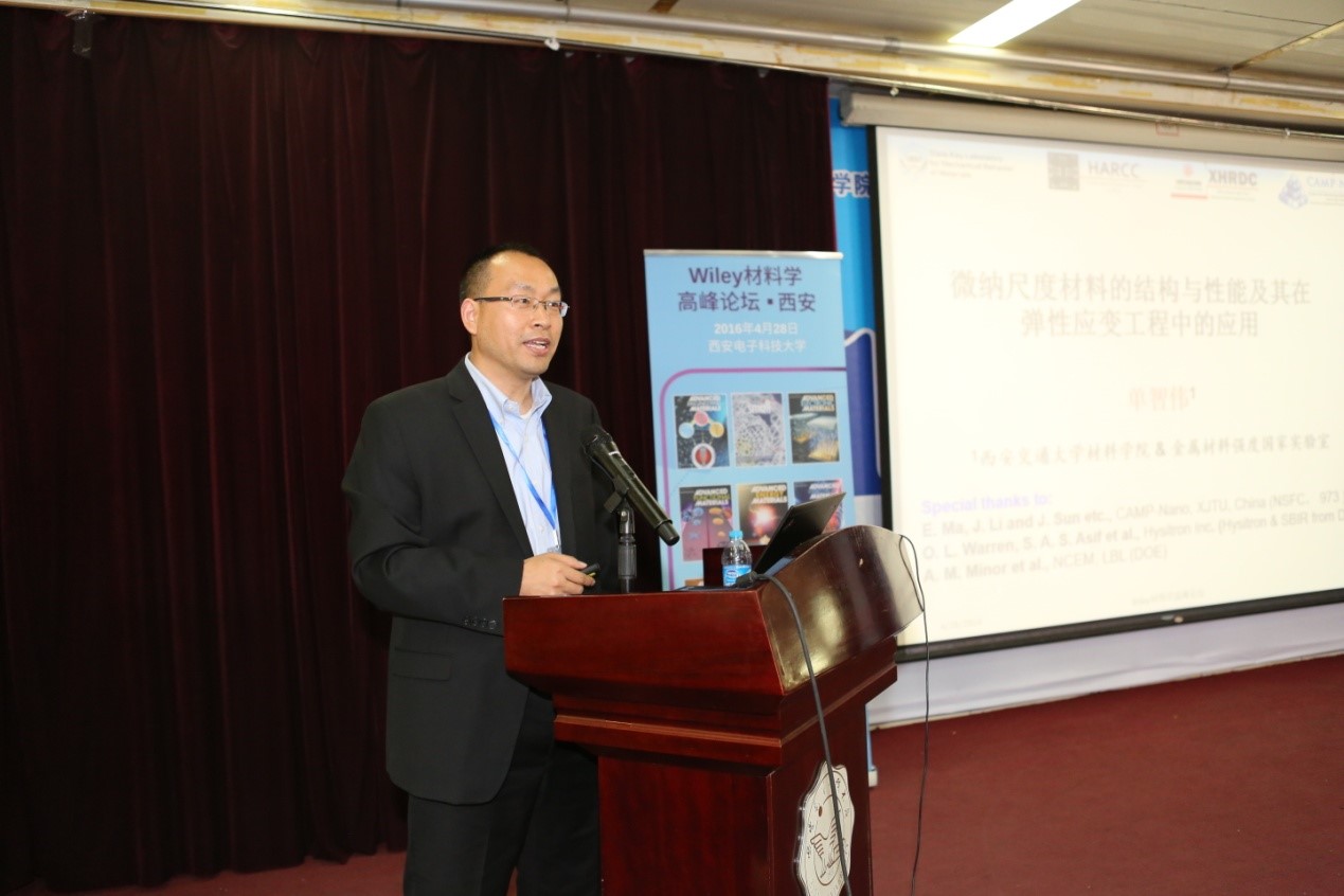 西安交通大学单智伟教授作了题为《微纳尺度材料的结构与性能》的报告。单志伟谈到,纳米科技的蓬勃发展带来了很多极富应用前景的新技术概念,如纳米探测器、纳米发电机以及纳米导线等。微纳尺度(10nm-10µm)作为连接宏观连续介质力学和量子力学的桥梁,也是材料各项性能发生剧烈改变的尺度区间。这个领域是目前科学研究的热点领域,不断地涌现出突破性的成果。单志伟教授的科研团队系统、定量地研究了微纳尺度结构材料的变形特性和相关机理,分析了这些特性对纳米器件的设计、优化及可靠使用的影响机制,提出了微纳尺度下“力致退火”、“力致愈合”以及“弹性应变工程”的概念。另外,他以ZnO纳米线为例,通过透射电镜原位形变的系列研究工作,证实了纳米材料的形貌特征与其表现出来的力学特性有着非常紧密的联系。