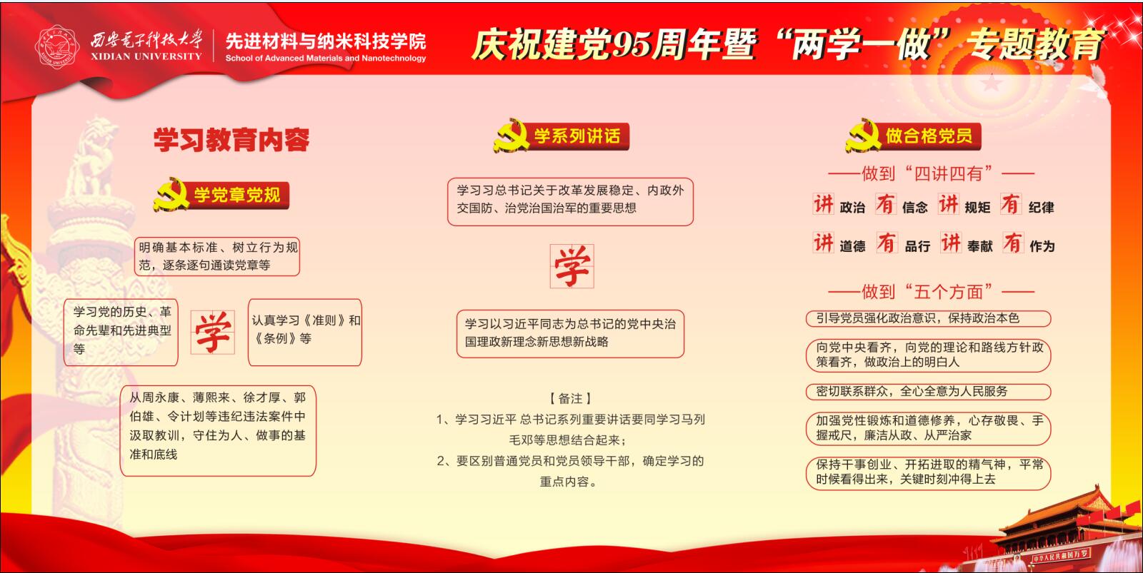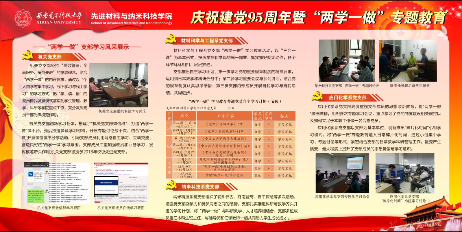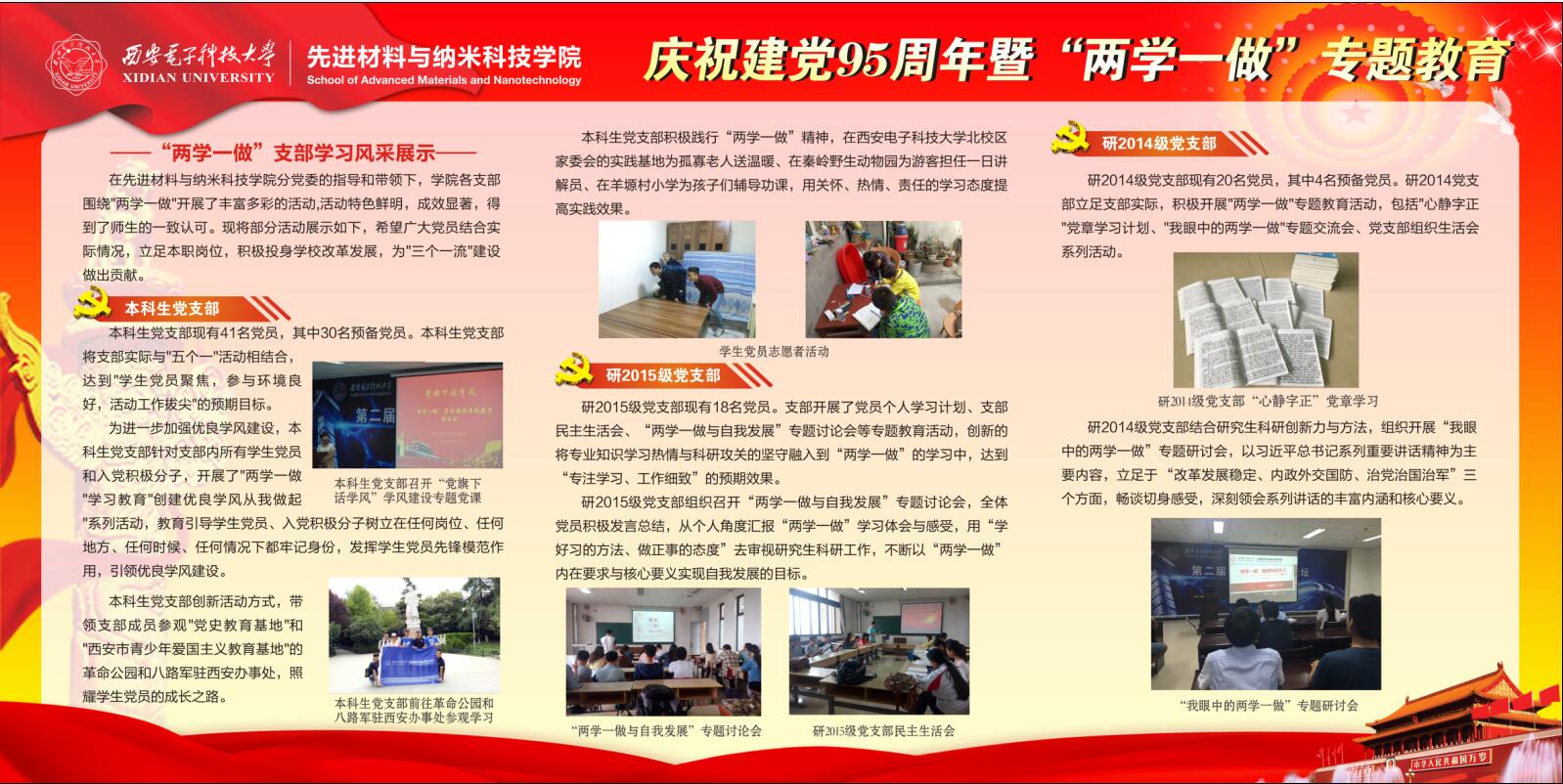 (通讯员 钟决坤 卢琳)为落实“两学一做”学习教育精神,充分发挥党员先锋模范作用,浓郁免费av 学习氛围,2016年9月,免费av 在G楼一层大厅免费av 文化展示区推出庆祝建党95周年暨“两学一做”教育专题展示。 免费av 积极开展“学党章党规、学系列讲话,做合格党员”学习教育活动,在免费av 分党委的指导和带领下,各支部以“两学一做”为中心开展了丰富多彩的学习教育活动,特色鲜明,成效显著。本次展示主要以展板的形式体现,紧紧围绕“两学一做”的核心教育内容、免费av 学习教育方案、各支部创意活动等内容,采用文字、图片和图表相结合的方式,全面、凝练且清晰的展示了“如何学、怎么做”,免费av 特色教育活动以及各支部将“两学一做”融入学习、教学、科研、管理等方面的风采。希望广大党员结合实际情况,立足本职岗位,积极投身学校改革发展,为“三个一流”建设做出贡献。(完)