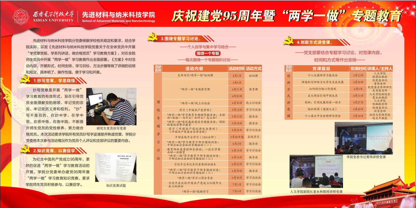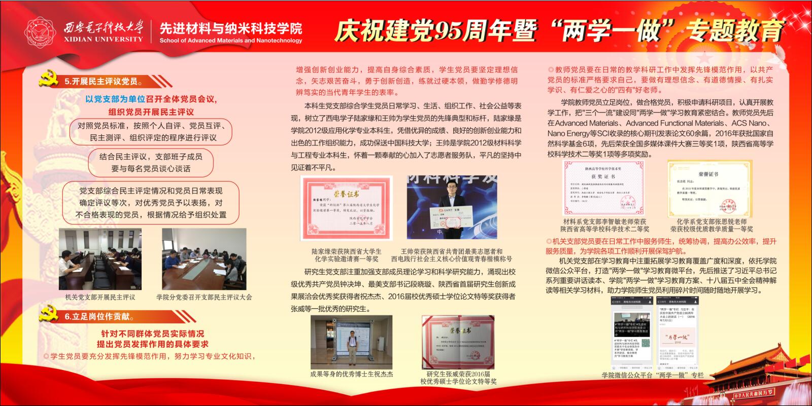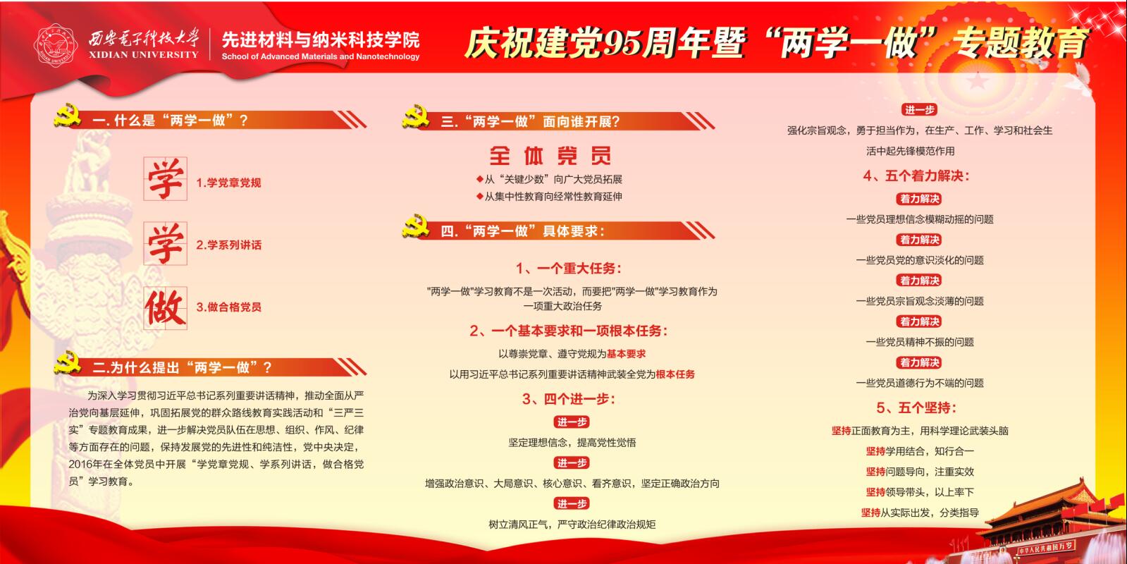 (通讯员 钟决坤 卢琳)为落实“两学一做”学习教育精神,充分发挥党员先锋模范作用,浓郁免费av 学习氛围,2016年9月,免费av 在G楼一层大厅免费av 文化展示区推出庆祝建党95周年暨“两学一做”教育专题展示。 免费av 积极开展“学党章党规、学系列讲话,做合格党员”学习教育活动,在免费av 分党委的指导和带领下,各支部以“两学一做”为中心开展了丰富多彩的学习教育活动,特色鲜明,成效显著。本次展示主要以展板的形式体现,紧紧围绕“两学一做”的核心教育内容、免费av 学习教育方案、各支部创意活动等内容,采用文字、图片和图表相结合的方式,全面、凝练且清晰的展示了“如何学、怎么做”,免费av 特色教育活动以及各支部将“两学一做”融入学习、教学、科研、管理等方面的风采。希望广大党员结合实际情况,立足本职岗位,积极投身学校改革发展,为“三个一流”建设做出贡献。(完)