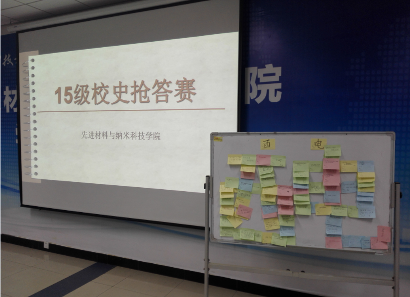 此次活动由班长胡永刚与孙丹宁主持,校史知识抢答赛总共分为六大部分:历史沿革、校风宗旨、学科建设、学术成就、校友领导和新生祝语。前五个部分均为校史知识问答,在此过程中,同学们参与积极,抢答氛围热烈,场面紧张而有序。最终产生三名优胜组,并颁发奖品。最后,每位同学将自己对学校的美好期望写下,贴成“西电”字样并合影留念。