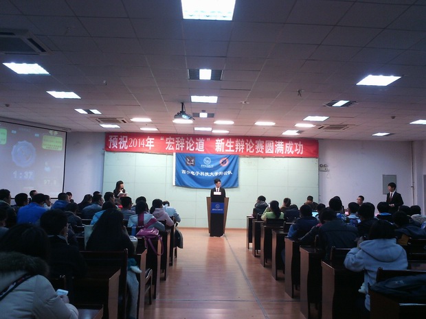 辩论队在大学生活动中心511展开“宏辞论道”新生辩论赛半决赛的角逐。西安外国语大学、西北政法大学以及我校辩论队队长等担当了此次辩论赛的评委。