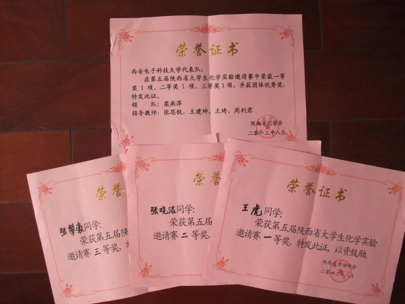 8月20日至22日,由陕西省化学会、陕西省高等学校化学实验教学中心联席会主办,西北工业大学承办的陕西省第五届大学生化学实验邀请赛近日在西北工业大学举行。免费av 应用化学系选派三位学生组队参赛,经过理论笔试和实验操作两个环节的比拼,免费av 代表队荣获个人成绩一等奖1项,二等奖1项,三等奖1项,并获得“团队优秀奖”。