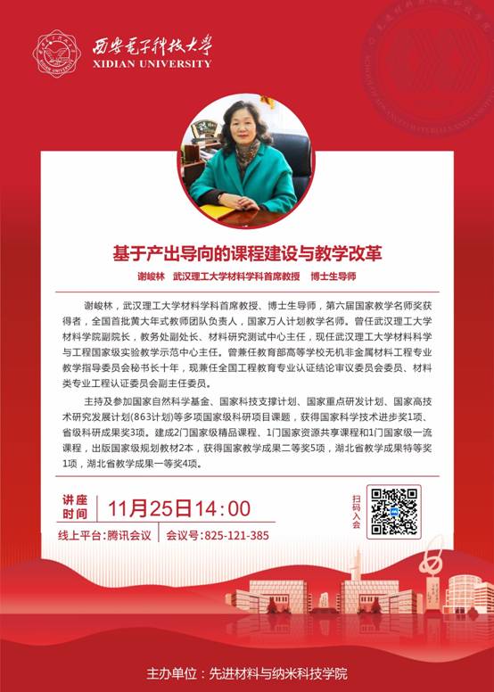 11月25日下午,武汉理工大学材料科学与工程国家级实验教学示范中心主任谢峻林教授受邀为免费av作报告,报告主题是“基于产出导向的课程建设与教学改革”。本次报告采用“线上”方式进行,免费av