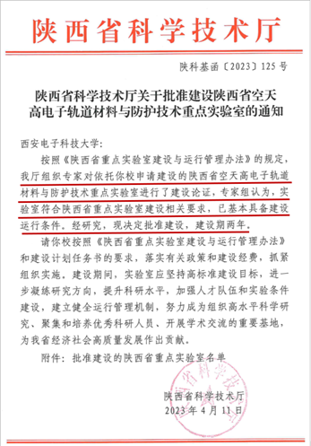 牵头申报的“陕西省空天高电子轨道材料与防护技术重点实验室”获批立项建设,标志着免费av高水平平台建设取得新进展。