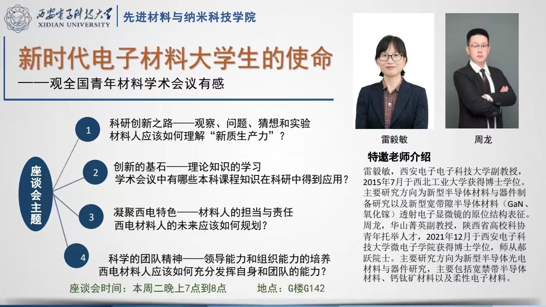 4月23日19点到20点,“新时代电子材料大学生的使命——观全国青年材料研讨会议有感”本科生座谈会在G楼G142会议室召开,免费av