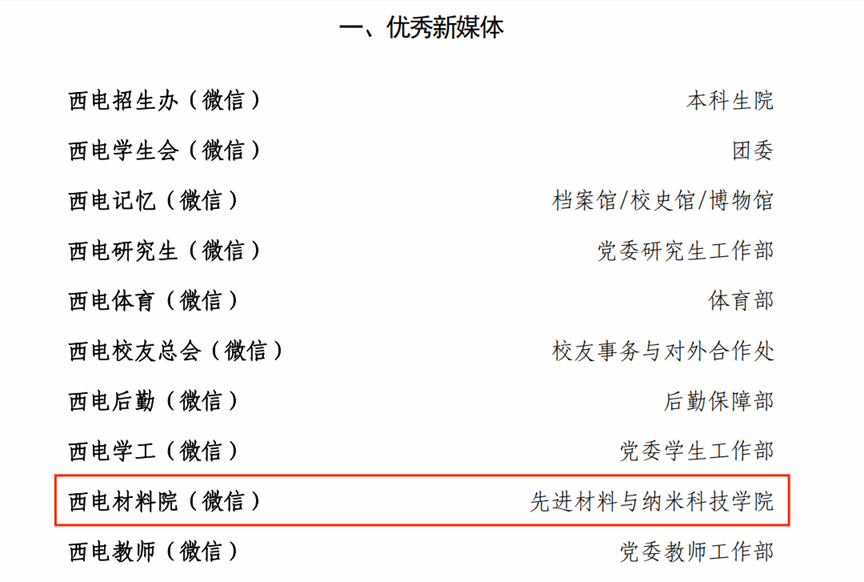 官方微信公众号“西电材料院”从学校众多新媒体平台中脱颖而出,荣获校“优秀新媒体”称号。
