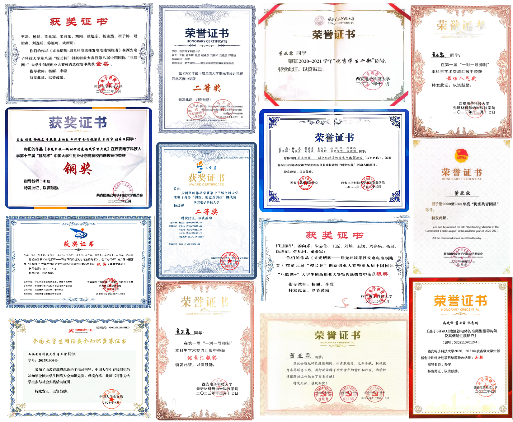 一直以来,董亚霖都很重视课程知识的学习除了课上认真听讲、课后及时复习总结之外,多向老师、同学请教是他最擅长的学习方法。“大学的课程知识比较难,幸好免费av 的任课老师很负责,常常在课后耐心地解答我们的问题;除此之外,身边优秀的同学也是我学习的榜样,和其他同学的交流更能加深我对知识概念的理解正是有了这些良好的学习习惯,董亚霖在高等数学(97)、场论与复变函数(99)、半导体物理(97)等课程上得到了较高的分数。在课业学习之余,董亚霖也积极参与学科竞赛,将所学的专业知识用于实践,加深对知识的理解和应用,目前已经获得了包括中国国际“互联网+大学生创新创业大赛省级银奖、全国大学生光电设计竞赛省级二等奖等省级及以上奖项5项、校级奖项4