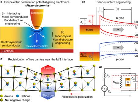 该工作在具有中心对称晶体结构的半导体(例如Si、TiO2等)中发现了一种新的电学调控机制-挠曲电电子学(flexoelectronics/flexotronics),利用金属-半导体界面处应力梯度引起的挠曲电极化电荷及其产生的极化电势,作为门极电压有效地调控界面肖特基势垒,从而控制界面处载流子的电输运特性(图1)。这项工作不仅阐述了具有中心对称晶体结构的半导体挠曲电电子学效应,也将压电电子学(Piezotronics)的研究从非中心对称半导体拓展到了中心对称半导体中;同时使挠曲电效应从绝缘体到半导体的研究得到了进一步的发展,尤其是将挠曲电效应用于半导体电子学方面的研究。