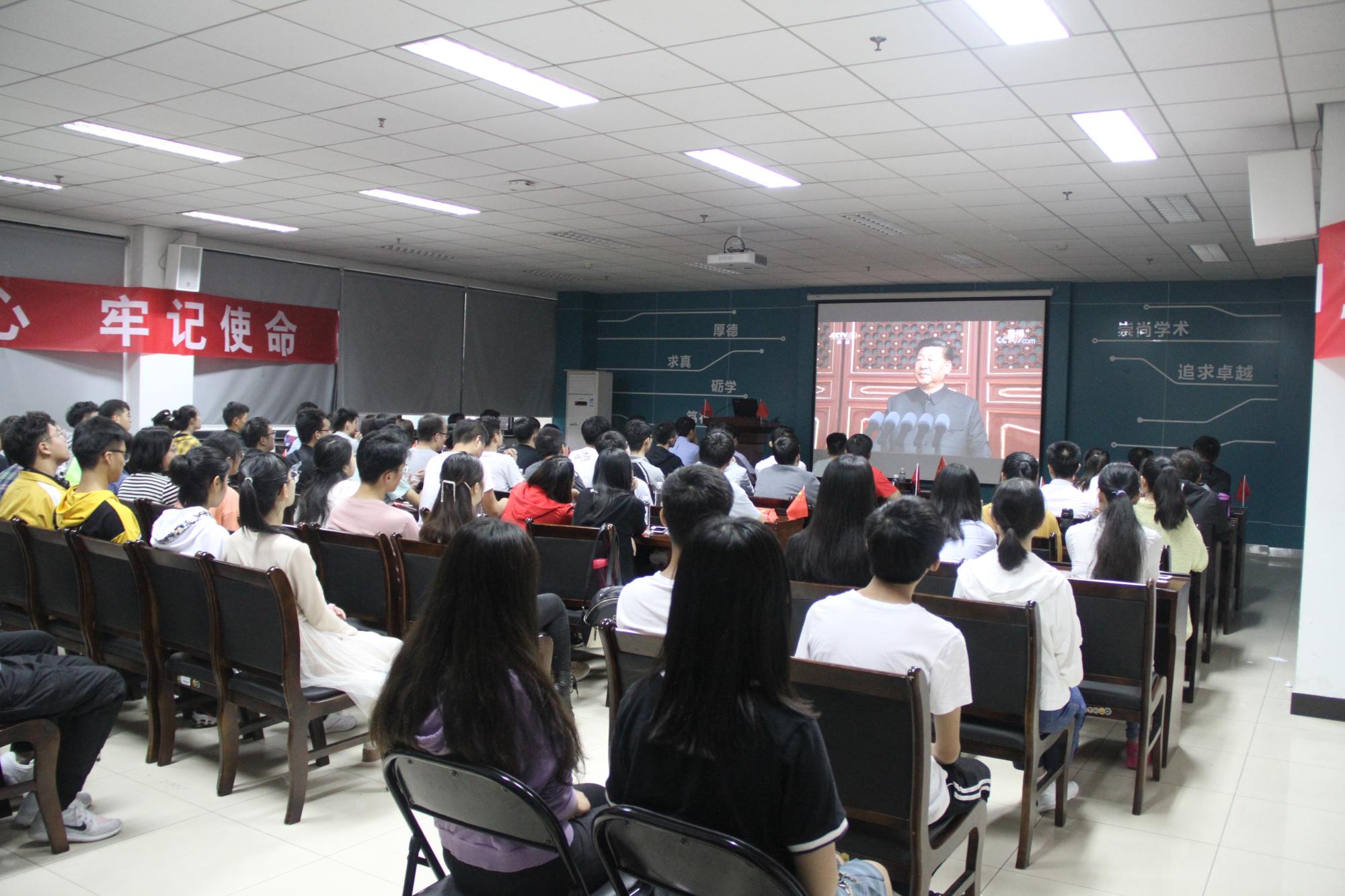 直播在上午10点正式开始,看着以习近平总书记为核心的党中央领导集体走出天安门城楼,大家不由自主响起了热烈的掌声。伴随着雄壮的国歌声,国旗徐徐升起,全体师生齐声高唱国歌,自豪之情油然而生。接着习近平总书记发表重要讲话,“中国的昨天已经写在人类的史册上,中国的今天正在亿万人民手中创造,中国的明天必将更加美好。全党全军全国各族人民要更加紧密地团结起来,不忘初心,牢记使命,继续把我们的人民共和国巩固好、发展好,继续为实现“两个一百年”奋斗目标、实现中华民族伟大复兴的中国梦而努力奋斗。”习近平总书记的讲话引起全场师生的强烈共鸣,不断地响起雷鸣般的掌声。