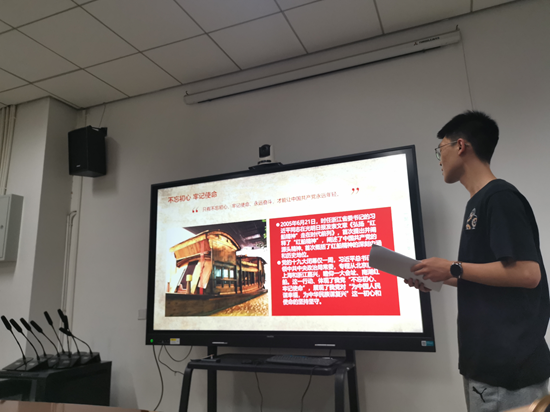 材料科学与工程系硕士研究生党支部在南校区G-119会议室进行书记讲党课活动,支部书记刘瑞宇讲述“不忘初心 勇立潮头,弘扬新时代红船精神”主题党课。