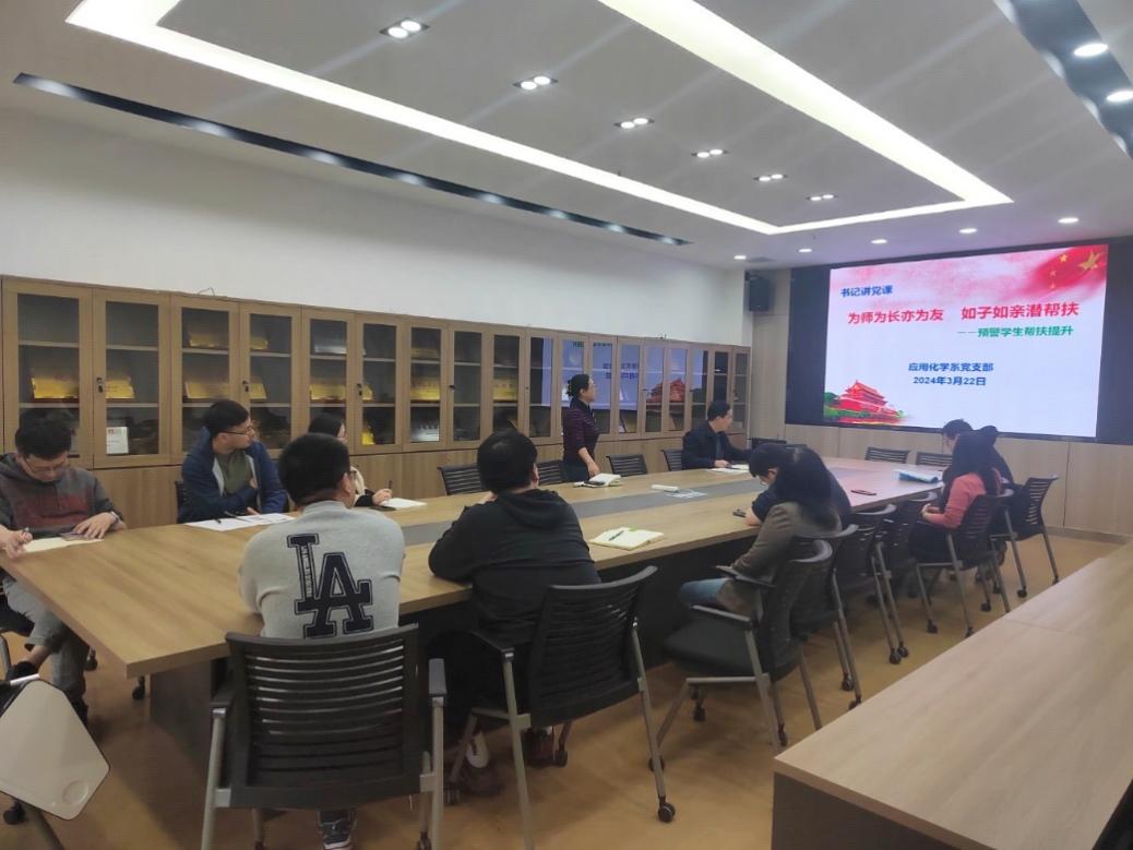 (通讯员 庞海丽 周利君)为全面贯彻党的教育方针,落实立德树人根本任务,充分发挥党员教师先锋模范作用,322日应用化学教师党支部开展了以“为师为亦为友 如子如亲潜帮扶”为主题的书记讲党课活动,推进党员教师与免费av 各年级预警学生包联帮扶暖心活动。免费av 党委书记宋刚、副院长施建章和支部12名党员教师参加活动。