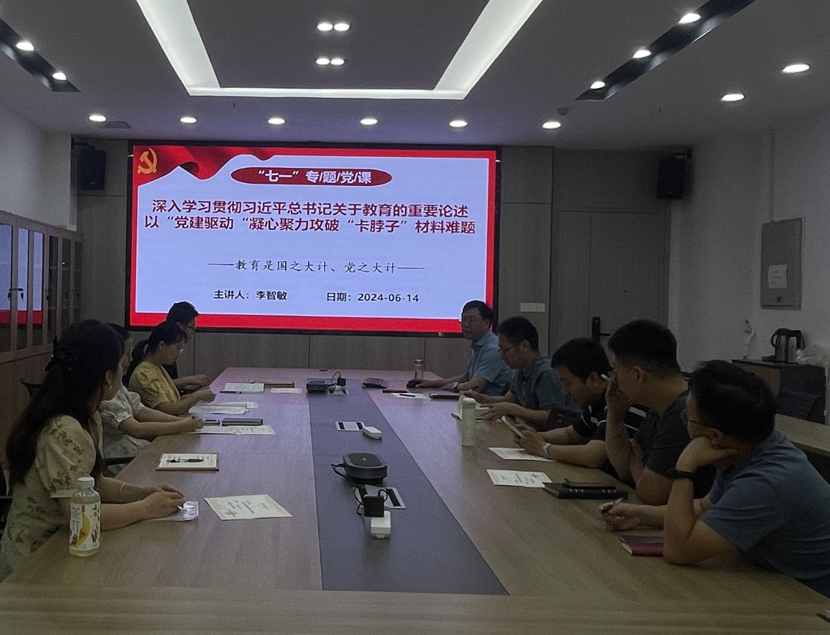 材料科学与工程系党支部组织支部党员在G楼142会议室召开会议,党支部书记李智敏以“深入学习贯彻习近平总书记关于教育的重要论述 ——以‘党建驱动’凝心聚力攻破‘卡脖子’材料难题”为主题讲授党课。
