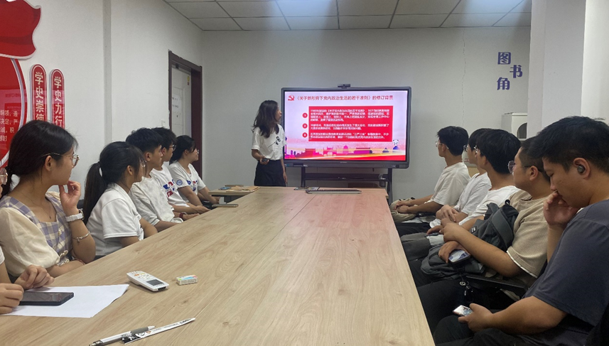 在重点解读环节,李逸君对党规党纪的三大板块和十二个部分进行深入分析。她特别强调了党内政治生活的重大作用和历史经验,明确了党内政治生活在党的建设中的核心地位。她也直面当前一些突出问题,如大学生考风考纪等,她强调,大学生作为国家栋梁,应以身作则,树立良好学术道德和诚信考试风尚。她呼吁每一位大学生党员,自觉遵守考试纪律,诚实守信,以实际行动维护学术纯洁性和考试公正性。号召全体党员学习贯彻党规党纪,深刻理解精神实质,不断提高政治素养和纪律意识,为党的事业贡献力量。