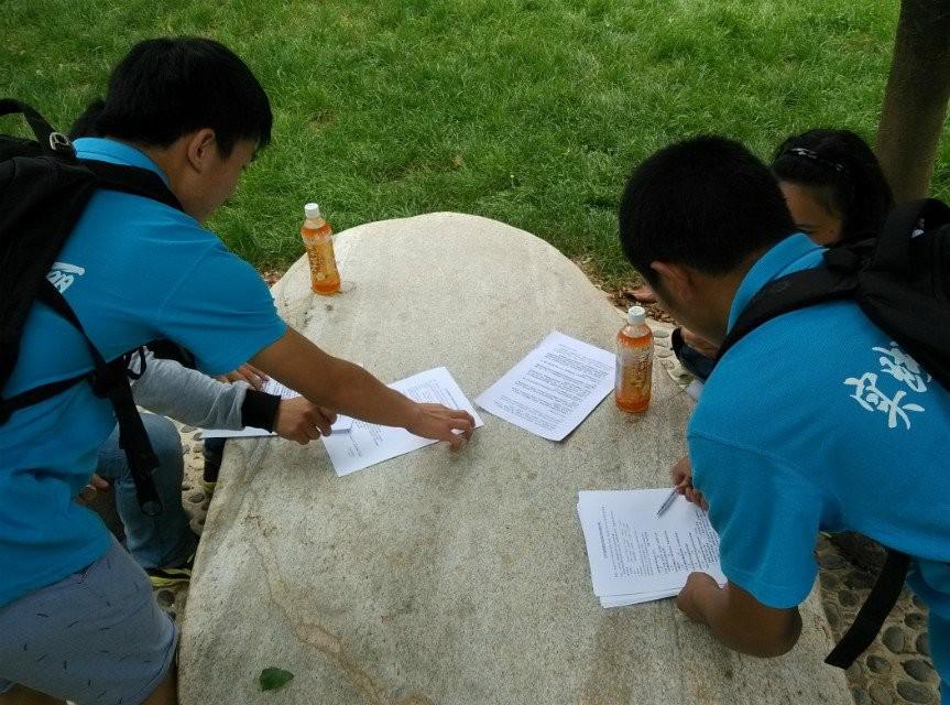 第一天我们的队员分成两个小分队,一号分队主要是与先前联系好的昆工学生一起对滇池水取样测定其藻类种类并记录,二号分队主要是在昆工校内外进行我们的宣传工作,让更多人来参与我们的的问卷。队员们相互配合,虽然天气炎热但队员们依旧很积极,正因为队友们的努力,宣传工作和藻类研究都进行得很顺利。