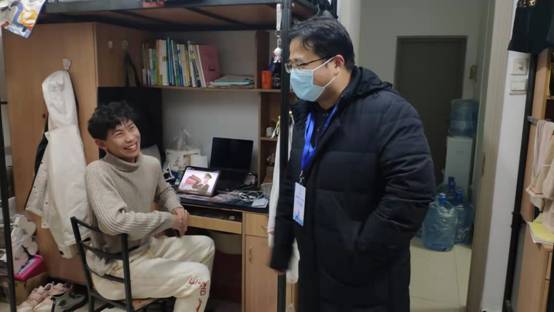 卢硕、杨如森、高宝铜、施建章分别来到海棠5号楼、8号楼、竹园4号楼、丁香11号楼学生宿舍,给因疫情防控要求不能“出门”的学子送去新年的祝福。他们与学生热情交谈,仔细询问学生疫情期间的思想、学习、生活等方面存在的困难,认真倾听学生心中不解的疑惑,耐心回答学生提出的问题,并嘱咐学生给家中牵挂的父母送上新年的问候。最后,他们也向同学们提出了希望,即希望同学们配合学校各项疫情防控工作、遵守各项疫情防控规定,在封控管理中规划好学习生活,不消极、不懈怠,不断提升个人的精神修养、知识储备、身心素质,静待疫情凛冬过,百花报春来。