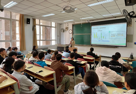 詹奉珍以“从招聘视角审视求职,把握秋招机会”为题,首先介绍了当前高校毕业生的就业形势,指出近年来存在岗位总体需求不稳、局部“冷热不均”以及招聘限制条件增加等严峻问题,并以近年来高热度行业招聘数据为例,着重分析了相关行业毕业生特征。随后她从求职心态、薪资福利、个人能力三个角度为毕业生求职就业提出了中肯的建议,“当你发自内心的想要干一件事情的时候,所有的困难都会为之让步。”她强调在求职过程中,同学们首先要了解自己,只有在此基础之上进一步明确职业目标,持续突破自身障碍,不断开发自身潜能,才能找到心仪的工作。最后,詹奉珍鼓励同学们要积极参加企业招聘会,多投简历、多参加面试、不断积攒经验,主动抓住秋季招聘黄金期的机会。