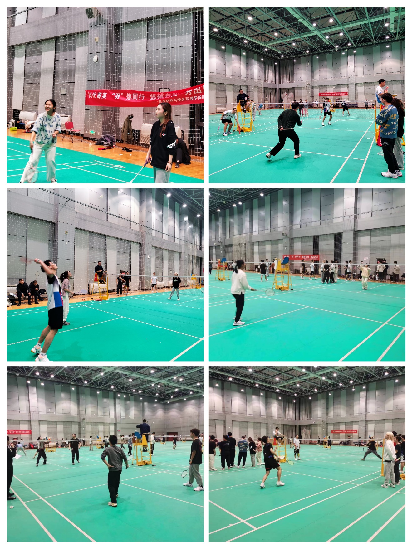 各年级研究生的优秀选手,选手们穿着轻便的运动装,活跃在各个赛场,在激烈的角逐中展示出娴熟的羽毛球技术以及团队协作精神,比赛气氛十分热烈。随着比赛的进行,选手之间的竞争也越来越激烈,他们纷纷拿出看家本领,一决高低,挑、抽、吊、杀,羽毛球在空中腾飞,赛场上喝彩声此起彼伏,不绝于耳,比赛如火如荼地进行着。在比赛中,选手们的飒爽英姿和高超的球技,充分展现了材料院学子的青春活力和顽强拼搏的精神。