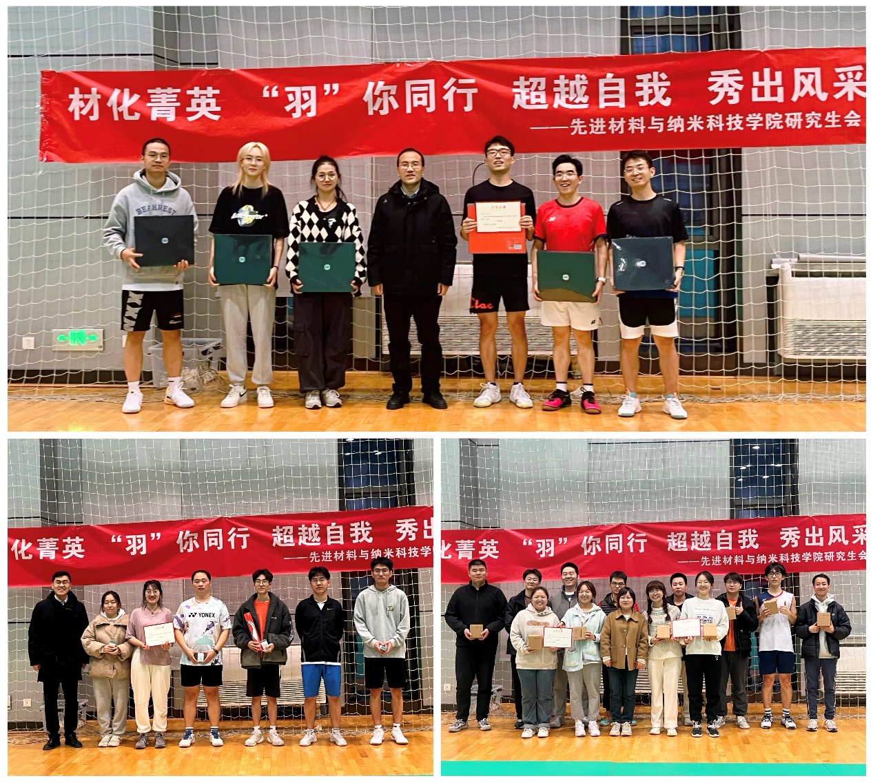 党委书记宋刚锋、党委副书记陈刚、研究生辅导员刘男三位老师分别为四支获奖队伍颁发了荣誉证书和奖品,向他们表示祝贺。在研究生会工作人员的辛苦工作、同学们的拼搏奋进中,羽毛球比赛落下帷幕。工作人员和参赛选手们合影留念,为这场精彩的比赛画上了圆满的句号。