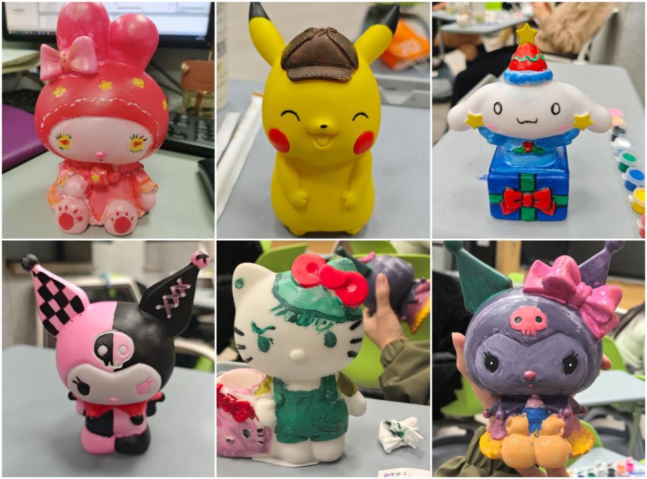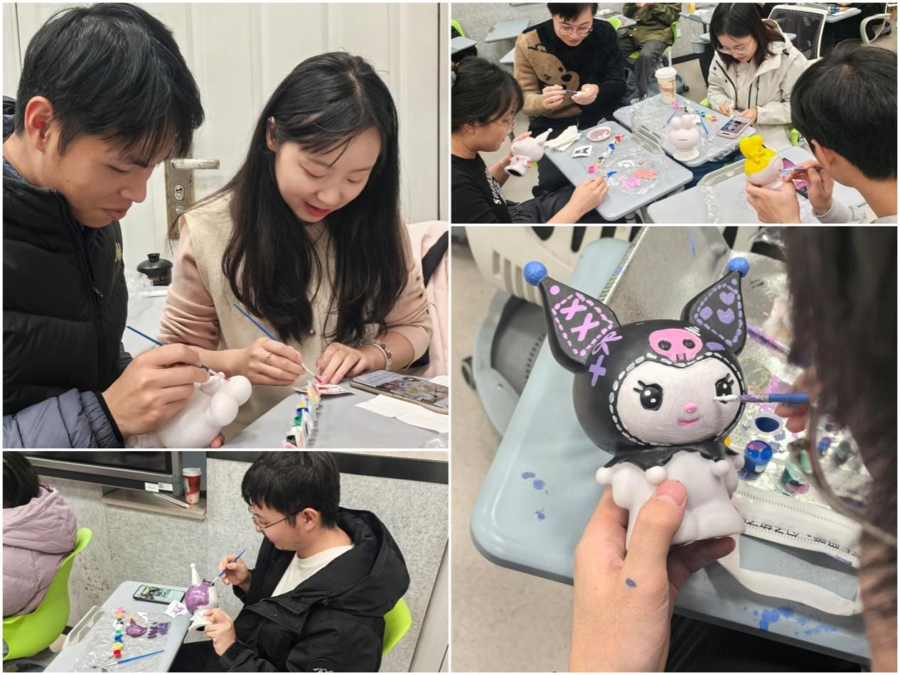 活动现场不仅为同学们准备了多种颜色的颜料和画笔,还特别提供了多种口味的下午茶,为参与者增添了一份暖意与甜蜜。同学们充分发挥想象力,为石膏娃娃注入五彩缤纷的生命力,有的绘制了经典可爱Hello Kitty,有的绘制了生动活泼的皮卡丘,还有的结合了多种元素设计出个性化的形象。创作过程中,大家一边交流创意,一边享受下午茶的香甜,氛围轻松愉悦。