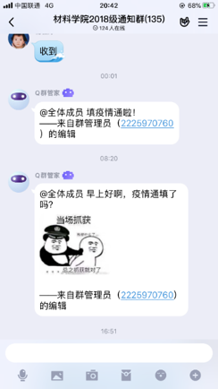 辅导员通过QQ群、微信群、钉钉等及时向学生转达发布学校相关教学、教育、管理等通知,通过班级心理委员和班级群,对学生进行思想引导和人文关怀,舒缓学生心理压力,鼓励学生以积极向上的心态投入到线上学习中,通过哔哩哔哩、腾讯会议等开启“云点名”,开启线上思政新模式。