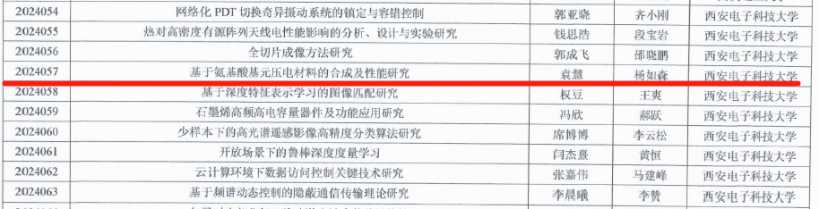 近日,陕西省教育厅和陕西省学位委员会正式下发了《关于公布2024年陕西省优秀博士学位论文评选结果的通知》(陕教〔2024〕39号),免费av 2018级博士生袁慧(指导教师:杨如森教授)所撰写的题为《基于氨基酸基元压电材料的合成及性能研究》的博士学位论文,获评“2024年陕西省优秀博士学位论文”。